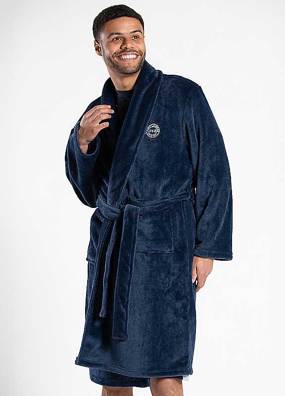 This plush dressing gown from Tokyo Laundry is a great addition to your night-time essentials. Features shawl collar, two front pockets, belted tie fastening, and Tokyo Laundry felt patch logo.Machine washableFollow care label100% PolyesterKeep away from fire. | wrap around robe, polyester robe, attached belt robe, navy blue robe, soft plush robe