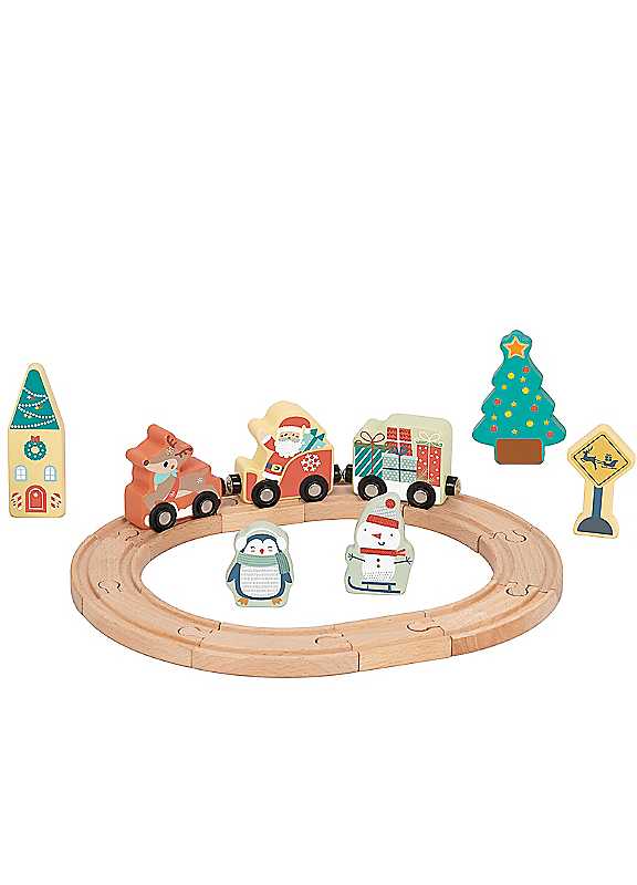 Bring holiday cheer to playtime with this charming wooden Christmas train set. It features a festive track layout and a colourful train with Santa, a reindeer, snowman and decorated tree. Perfect for tabletop play, the train glides smoothly along the track to spark imaginative stories. Made from sturdy, child-safe wood with non-toxic paints, it's both a fun toy and a festive decoration for the season.Age suitability: 3 years+Not suitable for children under 3 years old.