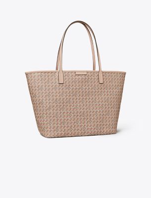 Ready for anything. A stylish tote that is supremely functional. Lightweight and durable in water-resistant coated canvas, our new Ever-Ready Tote has a secure zipped top and comes with a matching pouch. Slim straps are long enough to comfortably sit over the shoulder. Our iconic basketweave print is inspired by Tory's longtime fascination with basketry: Straw baskets in her Valley Forge home, woven bags found on travels, the caning of Parisian café chairs. The micro motif is both a statement and neutral.