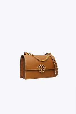 A striking expression of workmanship and artistry. Hand-woven braiding. Artisanal stitching. Natural-grain leather with our signature Double T. The new Miller Mini Bag is designed with an adjustable crossbody strap and a removable gold chain. The gusseted shape opens to multiple compartments, including two card pockets.