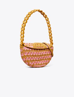 Enduring glamour. Colorful hand-woven raffia sealed with an embroidered Double T. The Mini Fleming Soft Crochet Crescent Bag has a chunky chain strap and a secure snap closure that opens to multiple card pockets for organization. Wear it tucked under the arm or crossbody with the removable strap.