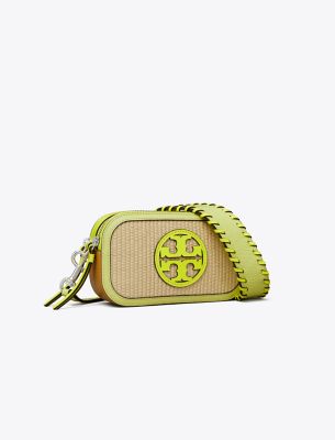 A new shape from our signature collection. The Mini Miller Crossbody Bag is crafted in woven nylon raffia with a laser-cut Double T and two zippered compartments. Wear it with or without the removable webbing strap.