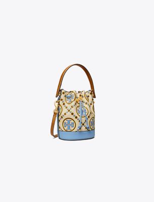 Tory Burch Women's Mini T Monogram Contrast Embossed Bucket Bag in White/Blue, One Size