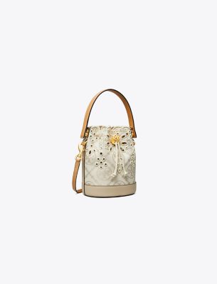 Tory Burch Women's Mini T Monogram Eyelet Bucket Bag in White, One Size