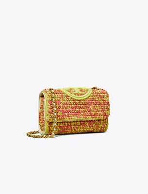 Beautifully crafted in colorful hand-woven raffia, the Small Fleming Soft Crochet Convertible Shoulder Bag is sealed with an embroidered Double T. Braided with brushed gold chain, the convertible strap can be worn long or short.