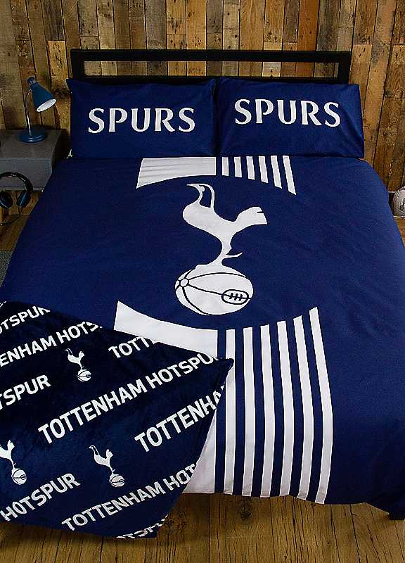Come on you Spurs! Perfect for any young Tottenham fan, this officially licensed Tottenham Hotspur Football Club bedding set includes a duvet cover and pillowcase(s). The bedding set features a reversible design, perfect for when you want to freshen up the look of your child's bedroom. The front side is inspired by Tottenham Hotspurs official colours, with a white striped pattern on a dark blue background, and the Spurs cockerel crest in the centre.The matching pillowcase is blue with 'Spurs' written in the centre in white. The reverse side features a repeating pattern of 'Tottenham Hotspur' with the cockerel from the club crest on a white background, with the pattern repeated on the pillow. The duvet cover is closed with poppers, so it's easy to remove and wash, and is both washing machine and tumble dryer safe.The bedding is made from recycled materials, and is a cotton and polyester mix, so not only is your child supporting their favourite team, they're also helping the environment! The single duvet cover measures 135 x 200cm, and the pillowcase included is a standard UK size of 74 x 48cm. The double duvet cover measures 200 x 200cm, and the 2 x pillowcases included are a standard UK size of 74 x 48cm.Reversible designPopper fasteningMachine washableTumble dry on a low temperatureIron on reverse52% BCI Cotton, 48% Recycled Polyester | football duvet cover, patterned duvet cover, reversible duvet cover, double duvet covers, colourful duvet cover