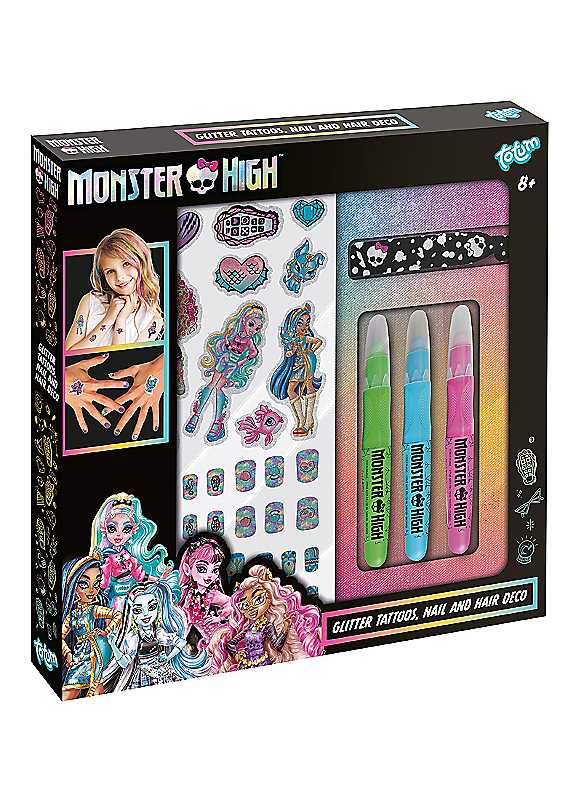 This fun Monster High licensed glitter tattoos, nail, and hair decoration set is a must-have for all Monster High fans. It comes with a sheet of easily removable tattoos, nail stickers, and three hair chalk pens in pink, blue, and green, so you can colour your hair, which washes out easily. It also comes with a hair band.Monster High licensedA must have for all Monster High fansSheet of easily removable tattoos, nail stickers 3 hair chalk pens in pink, blue & green, so you can colour your hairEasy wash out hair chalkAge suitability: 8+ yearsWarning: Small parts - chocking hazard, children must be supervised by an adult at all times. Not suitable for children under 3 years of age | childrens nail set, multi color nails, pink glitter nails, nail art stickers, hair accessories set, hair glitter, hair styling kit, hair tinsel kit, glitter hair clips, hair gift set, glitter hair tinsel