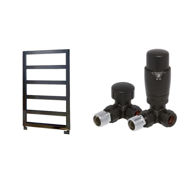 Towelrads Kensington Black Towel Radiator 900 x 530mm + Towelrads 105mm x 65mm Round Corner Thermostatic Radiator Valve Lockshield Valves Black