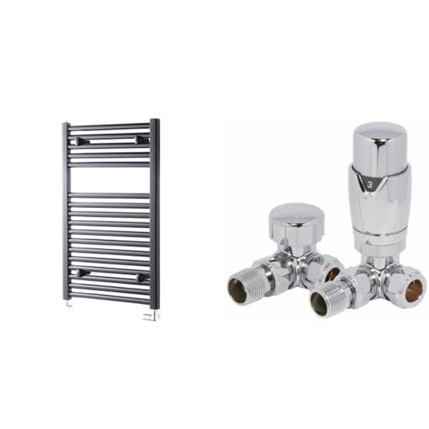 Towelrads Pisa Anthracite Towel Radiator 800 x 500mm + Towelrads 105mm x 65mm Round Corner Thermostatic Radiator Valve Lockshield Valves Chrome