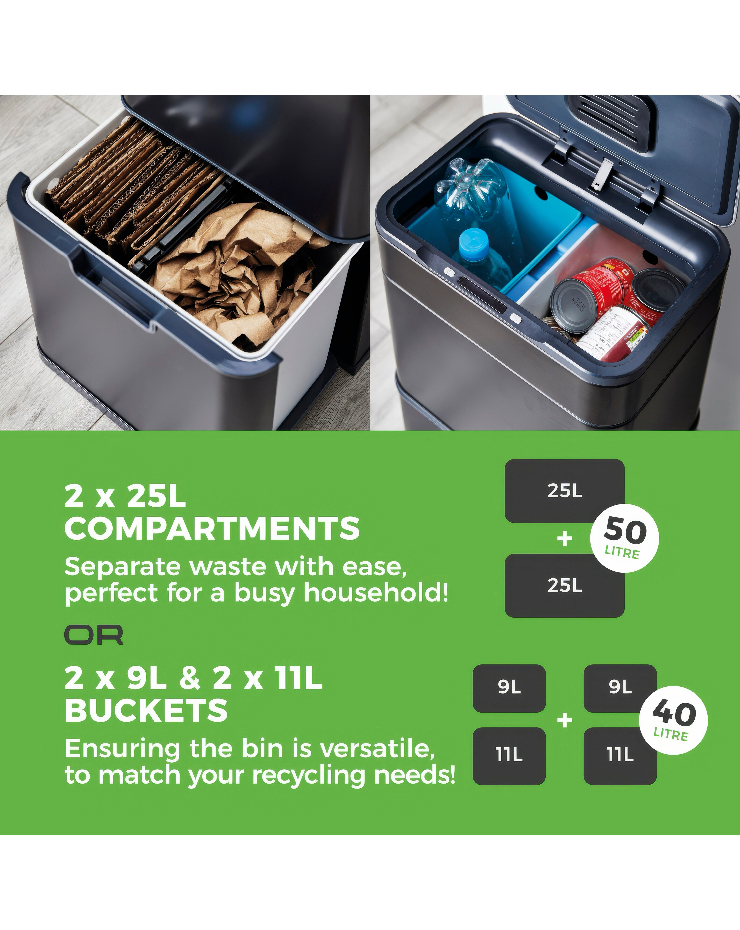 This 50L Recycling Sensor Bin is perfect for fuss-free hygienic waste disposal. Complete with infrared technology, you can open the bin hands free, although it can be used manually at the touch of a button. Ozone Filter Fresh technology helps to reduce unpleasant odours from within in the bin, whilst a carbon filter absorbs moisture. Just press and hold the button for 5 seconds to begin the 60 second cycle. It can be used as a 50L bin with two 25L compartments or a 40L bin with two 9L compartments and two 11L compartments that will keep waste expertly separated for fuss-free waste disposal. The inner buckets are removable and require a simple wipe clean with a damp cloth to maintain the pristine finish, whilst the body is constructed from stainless steel, with a fingerprint proof coating. HANDS-FREE OPENING: Infrared technology means the bin lid automatically opens with one swift hand motion, for smart and hygienic waste disposal. OZONE FILTER FRESH TECHNOLOGY: Ozone Filter Fresh technology reduces unpleasant odours in the bin, filtering out particles for fresher air. Press and hold the button for five seconds with the bin lid closed, to begin the 60 second cycle. Technology within the bin lid has been specifically designed to eliminate bacteria & odours, ensuring a fresh & clean smelling environment. REDUCES UNPLEASANT ODOURS: The carbon filter that sits within a compartment in the bin lid also helps to reduce unpleasant odours & absorbs moisture from within the bin - this, combined with the Ozone filter fresh technology, allows you to make full use of your bins capacity. Replacement filters are available to purchase - we recommend replacing the filter every 3 months. The inner buckets can be removed for easy cleaning. BATTERY OPERATED: The bin requires 6 x AA batteries to operate (batteries not included). 5 YEAR GUARANTEE: Trusted Tower quality with a standard 1 year guarantee and optional 4 year extension, subject to product registration online.