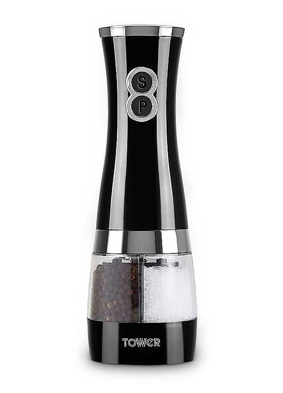 Tower's electronic duo salt and pepper mill in black are a must-have essential for your dinner table. The elegantly designed duo mill includes a battery-operated mechanism that adds a touch of class to any evening meal. Featuring an adjustable grinder function, you can choose whether to have fine or coarse salt and pepper seasoning suited to your taste. The clear acrylic chambers in the main body offer viewing windows so you can keep an eye on the level of the contents for a top up and for added convenience. You only need to press a button for the mill to operate for effortless usage.DURABLE AND SMOOTH ABS BODY CONSTRUCTION: Easy to fill clear acrylic chambers with large capacity make this elegantly designed duo salt and pepper mill a must-have accessory on your dining table, providing seasoning for all your favourite meals. To fill simply unscrew the mill. You can keep an eye on the level of your salt and pepper using the clear acrylic as an ideal viewing windowSTYLISH PLATED DECORATIVE PARTS: Presented in a stylish black coating and modern silver accents, perfect for a contemporary kitchenBATTERY OPERATED GRINDING MECHANISM: For your convenience, the mill is easy to use with a simple one button push system on each side for effortless salt or pepper seasoning. Requires 6 x AA type batteries (not included)TWO PUSH BUTTONS FOR GRINDING SALT & PEPPER: Effortless grinding with simple button operation. Enjoy the satisfaction of seeing the operation taking place without strenuous manual handling on your partADJUSTABLE CERAMIC GRINDERS FROM COARSE TO FINE: Providing superior seasoning, this duo mill features an adjustable grinding function offering fine and coarse seasoning to suit your family's preferencesSPACE-SAVING: The 2-in-1 duo mill saves space on your worktop, making it ideal for the smaller kitchen3 YEAR GUARANTEE: Trusted Tower quality with a standard 1 year manufacturer's guarantee, with an optional 2 year extension, subject to product registration onlineA BRAND YOU CAN TRUST: Tower is an iconic British brand boasting over 100 years of quality in manufacturing and design excellence. Tower is the UK's fastest growing SDA & Housewares brand loved by millions of householdsAcrylicDimensions approx. 21.50 x 7.00 x 7.00 cm | kitchen tools for gifts, cool kitchen gadgets, unique kitchen accessories