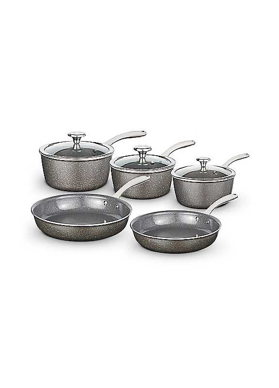 Create deliciously healthy fat-free meals with this 5 Piece Pan Set, the essential pan set for all of your kitchen needs including 18/20/22 cm saucepans with glass lids, and 20/24 cm frying pans. Featuring high-grade non-stick technology, the Cerastone Pro coating is 15x stronger than other non-stick coatings, and is PFAO, PTFE, PFAS, lead and cadmium-free so you can enjoy healthy meals using little or no oil. Each pan is crafted with a high quality, long-lasting forged aluminium body enabling quick and easy adjustment of temperatures for more efficient cooking results with no hot spots, and they have a riveted steel handle for comfortable control when cooking. A bonded steel base provides even heat distribution ensuring food thorough cooking, and is compatible with any hob type including induction. The non-stick coating prevents food from sticking, and this pan set is dishwasher safe for an even easier clean. Collect the full Cerastone Pro range for all your best loved dishes, with 100% recyclable products and packaging. INDUCTOTM BONDED STEEL BASE: The InductoTM bonded steel base heats the pan 25% faster than standard induction bases saving on time and energy. Its unique structure also ensures even heat distribution across the entire pan surface for superior cooking results and ensuring no more hot spots. Our InductoTM induction ready bonded steel base is suitable for all hob types. HEAVY GAUGE CONSTRUCTION: Cerastone Pro pans are to last, crafted from ultra-tough 4mm forged aluminium with an InductoTM base to ensure even heat distribution when cooking, Metal utensils can be used with Cerastone Pro pans, with no risk of scratching, whilst they are safe to clean in the dishwasher. PREMIUM RIVETED STEEL HANDLES: Handles are extra-long for added comfort and are also made from riveted steel for extra strength. The steel handles mean that Cerastone Pro pans are safe to use in the oven to temperatures of 220C. ROLLED EDGE CONSTRUCTION: Cerastone Pro pans are constructed with near vertical edges, offering an easy pour onto plates and bowls. A BRAND YOU CAN TRUST: is an iconic British brand boasting over 100 years of quality in manufacturing and design excellence. is the UK's fastest growing SDA & Housewares brand loved by millions of households. Compatible with all hob types including inductionOven safeDishwasher safeHand wash recommended AluminiumSmall saucepan approx. 9H x 35.5W x 18D cm Medium saucepan approx. 10H x 37.5W x 20D cm Large saucepan approx. 11H x 42W x 22D cm Small frying pan approx. 43.5W x 20D x 4.5H cm Large frying pan approx. 47.5W x 24D x 5H cm