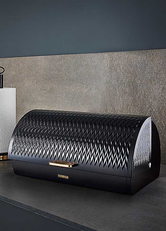 The Tower Empire bread bin provides a luxury home for your baked goods. Boasting a 20s-inspired Art Deco design with decadent detailing and V-shape geometric pattern, the roll top bread bin elevates the look of your kitchen using vintage d©cor. Its stainless steel structure offers durable storage with a large capacity to fit a variety of loaves, bagels and muffins inside. The body is topped with ventilation holes to lock in the freshness for a longer period of time, complete with bar handle to easily access stored goods. A simple wipe down with a damp cloth makes it easy to maintain its elegant mirrored finish.ART DECO DESIGN: Elegantly-embossed Art Deco design with V-shaped geometric pattern adds vintage style to your kitchenLARGE STORAGE SPACE: Provides a large inner capacity for storing bread, bagels, muffins and more fresh goodsFRESH FOR LONGER: A ventilated body filters fresh air to extend the life of your bread and baked snacksEASY ACCESS: Roll top lid with bar handle is easy to pull up and access stored contentsSIMPLE WIPE CLEAN: Easy-to-clean bread bin requires just a simple wipe down with a damp cloth to maintain its mirrored finish2 YEAR WARRANTY: The product comes with a standard 1 year warranty, with an additional 1 year added once you register the product onlineStainless SteelDimensions approx. 19.00 x 39.00 x 27.50 cm