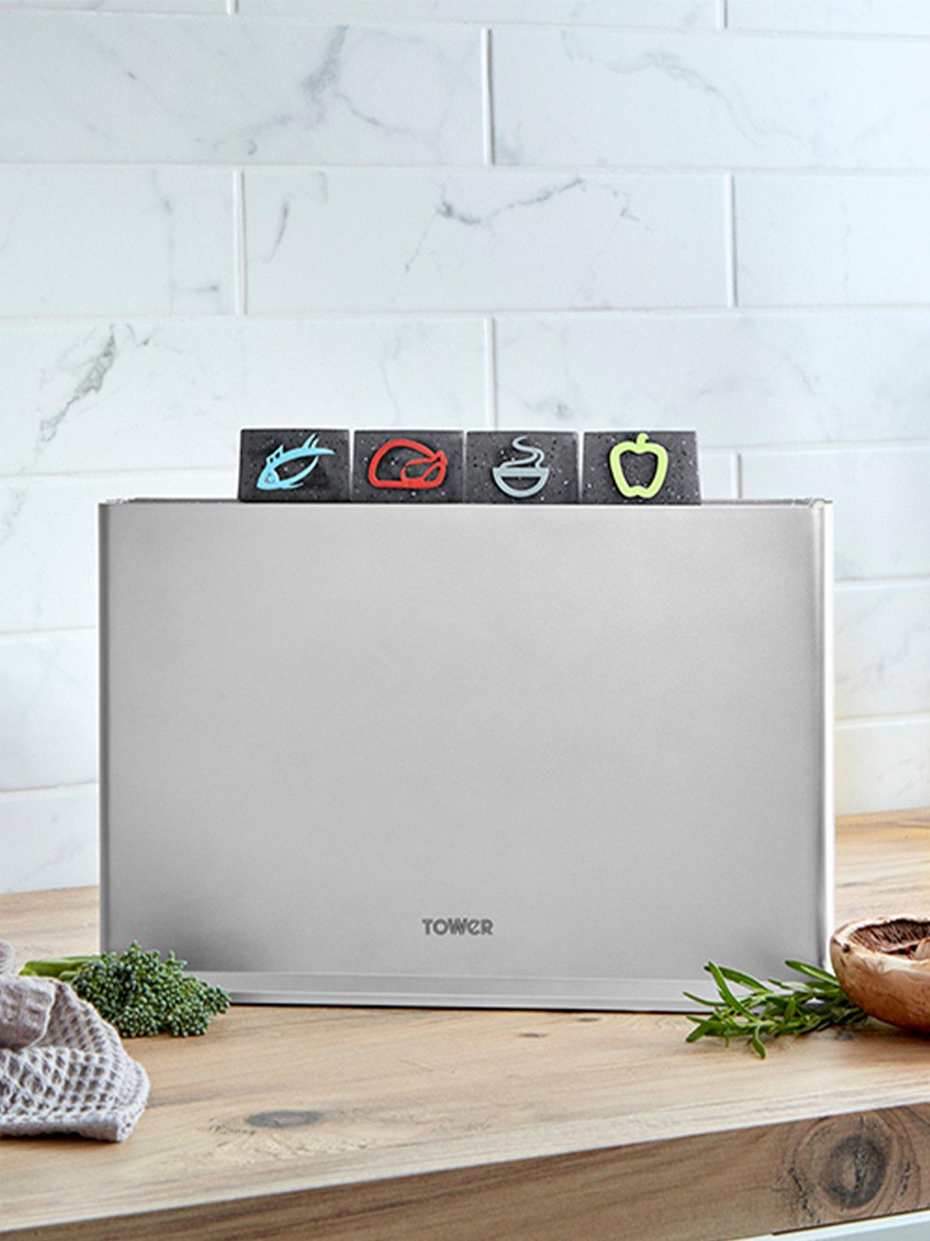 Tower Set Of 4 Chopping Boards Keep Your Kitchen More Organised While Also Increasing Your Cooking Hygiene With This Set Of 4 Chopping Boards From Tower. Presented In A Slimline, Space-Saving Storage Stand, All Four Boards Are Made From Knife-Friendly Plastic With Fleck Designs For An Ultra-Modern Look And Feel. Each One Measures 29 X 22.5 Cm, And They All Feature Colourful Illustrated Index-Style Tabs For A Wide Range Of Foods - Fruit And Veg, Cooked Food, Meat And Fish. Not Only Does This Make It Easy To Pull Them Out Of The Stand, But It Also Reduces The Chances Of Cross-Contamination When Whipping Up Your Culinary Creations. Non-Slip Feet On Both The Stand And Boards Aid In Safety During Use, And The Boards Themselves Are Also Dishwasher Safe For Easy Cleaning. Each Chopping Board Measures 29Cm (L) X 22.5Cm (W) X 0.6Cm (D) And Comes Complete With A Storage Stand Material Content: Plastic Illustrated Index-Style Tabs Show Different Boards For A Different Range Of Foods. A Great Way To Prevent Cross-Contamination Of Foods Store The Boards Neatly In The Narrow Stand And Within Convenient Reach. A Space-Saving Idea For Everyday Use Keeping The Kitchen Worktop Organised Easy Clean And Knife-Friendly Cutting Surfaces Ensure An Ideal Food Preparation Environment Without Fuss. When Finished Usingpop Into The Dishwasher Boards Feature A Fleck Design. Simple Functionality With An Ultra-Modern Look And Feel Cut With Precision And Stay Safe Knowing That The Non-Slip Feet Protect The Chopping Board From Sliding Trusted Tower Quality With A Standard 1 Year Manufacturer?S Guarantee And A 1 Year Extension, Subject To Product Registration Online Tower Is An Iconic British Brand Boasting Over 100 Years Of Quality In Manufacturing And Design Excellence Dimensions: Height 29 X Width 22.5 X Depth 0.6Cm