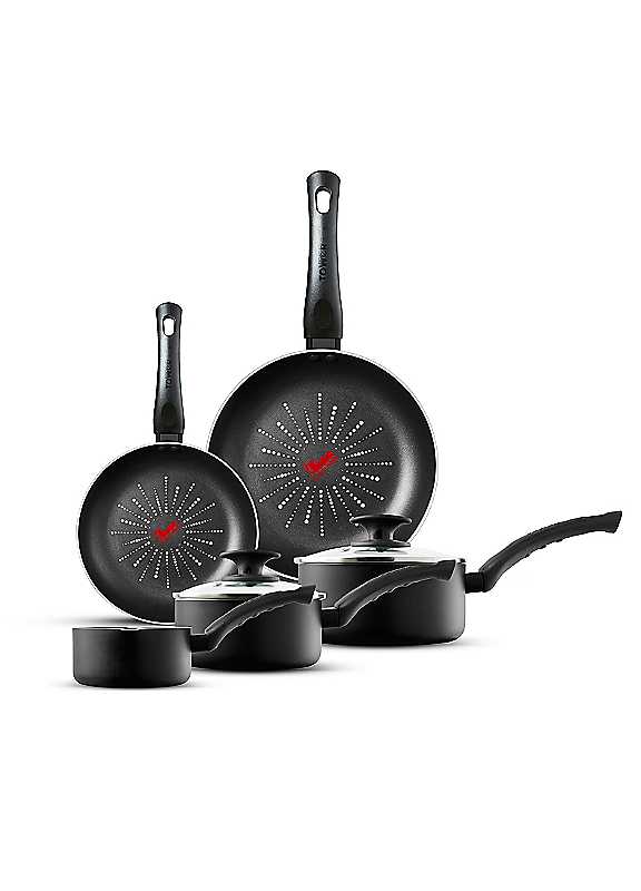 This 5 piece cookware set offers great versatility with 20cm/24cm frying pans, a 14cm milk pan and 16cm/18cm saucepans. Presenting innovative SmartStart technology with a built-in temperature sensor that lets you cook like a Pro. Put the pans onto the heat and wait for the SmartStart tick to change to dark red and start cooking. Each pan is lightweight and ultra-tough with expertly crafted 2.5mm thick aluminium. Great heat conductivity properties ensure quick heat-up time with easy manoeuvrability. The innovative Aeroglide non-stick coating is 3x stronger than standard non-stick coatings. The Aeroglide coating provides superior food release, is easy to clean after use and is dishwasher safe. Each pan is oven safe up to 170°c for 40 minutes, allowing for versatility and expansion of recipe ideas. All SmartStart pans are free from harmful chemicals such as PFOA, Lead and Cadmium. Sustainable materials have been used, with fully recyclable products and packaging. Suitable for all hob types, except induction.The essential cookware set for all of your cooking needs. Consisting of a 14cm milk pan with pouring lips for easy serving, 16cm/18cm saucepans and 20cm/24cm frying pans, you have the versatility to cook a variety of different pasta dishes or fluffy pancakes. The saucepans have tempered glass lids with steam vents, allowing for greater control over cooking, letting you take a peek without interrupting the cooking process.A temperature sensor is built into the non-stick coating of the frying pans that changes from bright red to dark red as soon as the pan reaches the optimum temperature. Simply pop the pan on the hob to heat up, wait for the SmartStart tick to change to dark red and take the guess work out of cooking for perfect results every time.The Aeroglide coating consists of a base layer and durable abrasion layers.The 3-layers coating is 3 times stronger compared to standard non-stick coatings for superior food release and easy clean. The exterior is finished with a heat resistant coating for improved safety. The durable Aeroglide coating ensures that you can use nylon utensils without risking any damage to the pan.All SmartStart Classic pans are free from harmful chemicals such as PFOA, Lead and Cadmium. Each pan is lightweight and ultra-tough thanks to expertly crafted 2.5mm thick aluminium. Great heat conductivity properties and lightweight design ensures quick heat-up time with easy manoeuvrability.Trusted Tower quality with a standard 1 year guarantee and 1 year extension, subject to product registration online.Dishwasher safe, handwash recommendedAluminium14 cm milk pan with 2 pouring lips dimensions approx. W29.8 x D16 x H11.5cm - 1L Capacity, 16*7.5cm saucepan with lid dimensions approx. W32 x D16.4 x H13.3 cm -1.4L Capacity, 18*8.5 cm saucepan with lid - W36.9 x 18.4 x H13.8 cm -2.1L Capacity, 20*4 cm frying pan dimensions approx. 35.6W x 20D x 6.2H cm, 24*4.5 cm frying pan - 42.5W x 24D x H8.5H cm