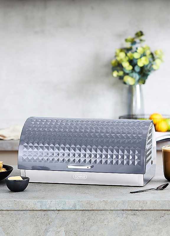 Tower's Solitaire bread bin provides premium storage for your fresh baked goods. Its stainless steel design coated in a sleek grey colour give your countertop a touch of contemporary appeal. The built-in ventilation system traps moisture to prevent goods from drying out, preserving their fresh texture and taste for longer. A large inner capacity provides enough room to store bread loaves, crumpets and bagels of varying sizes, complete with roll top lid and bar handle to easily access held contents. Its durable stainless steel body requires just a simple wipe down to maintain the pristine finish.Compact bread bin with large inner capacity is ideal for storing various breads and baked goodsDurable carbon steel container body helps maintain the freshness of your bread with a ventilated back to ensure it stays tasty for longerThe bread bin is complete with a built-in roll top lid and bar handle, to provide quick and easy access to contents when it's time for snacking or preparing dinnerIts mirror-effect body requires a quick wipe down with a damp cloth to maintain the pristine finishProtecting your countertop from scratches and marksEmbossed in a 3D diamond pattern decoration, the Solitaire collection elevates modern design in the home Trusted Tower quality with a standard 1 year guarantee and optional 2 year extension, subject to product registration onlineTower is an iconic British brand boasting over 100 years of quality in manufacturing and design excellenceTower is the UK's fastest growing SDA & Housewares brand loved by millions of householdsStainless Steel