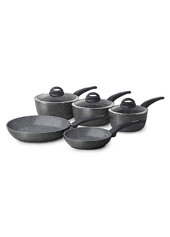 Create deliciously healthy fat-free meals with the Tower Forged 5 Piece Pan Set, the essential pan set for all of your kitchen needs including 18cm, 20cm and 22cm saucepans with glass lids, and 20cm and 28cm frying pans. Featuring high-grade non-stick technology, the Cerastone coating is 5x stronger than other non-stick coatings, and is PFAS, lead and cadmium-free so you can enjoy healthy meals using little or no oil. Each pan is crafted with a high quality, long-lasting forged aluminium body that enables quick and easy adjustment of temperatures for more efficient cooking results with no hot spots, and they all have a soft touch, non-slip handle for comfortable control over your cooking.A bonded steel base provides even heat distribution to ensure your food is cooked thoroughly, and is designed to work with any hob type including induction. The non-stick ceramic coating prevents food from sticking to the surface, and this pan set is dishwasher safe for an even easier clean after cooking. Collect the full Cerastone range for all your best loved dishes, with 100% recyclable product and packaging.5 PIECE PAN SET: The essential pan set for all of your kitchen needs - heat up your food using the 18cm, 20cm and 22cm saucepans with glass lids, & 20cm & 28cm frying pansSUPERIOR NON-STICK COATING: The multi-layer Cerastone coating is 5x stronger than other non-stick coatings, & is PFAS, lead & cadmium-free so you can enjoy healthy meals using little or no oilQUALITY CONSTRUCTION: Each pan is crafted with a high quality, long-lasting forged aluminium body that enables quick & easy adjustment of temperatures for more efficient cooking results, with no hot spotsSTAY COOL HANDLE: Each pan features a soft touch, non-slip handle for comfortable control over your cookingSUITABLE FOR ALL HOB TYPES: A bonded steel base provides even heat distribution to ensure your food is cooked thoroughly, & is designed to work with any hob type including inductionDISHWASHER SAFE: The non-stick ceramic coating prevents food from sticking to the surface, & this pan set is dishwasher safe for an even easier clean after cookingPART OF THE CERASTONE COLLECTION: Collect the full Cerastone range for all your best loved dishes, with 100% recyclable products (excluding handles & knobs) & packaging5 YEAR GUARANTEE: Trusted Tower quality with a standard 1 year guarantee & 4 year extension, subject to product registration onlineA BRAND YOU CAN TRUST: Tower is an iconic British brand boasting over 100 years of quality in manufacturing & design excellence. Tower is the UK's fastest growing SDA & Housewares brand loved by millions of householdsAluminiumDimensions approx. 15.00 x 47.50 x 29.01 cm | non stick frying pan, non stick pan set, induction non stick pans, dishwasher safe non stick pans, high quality non stick pan, ceramic non stick pans, healthy non stick pan