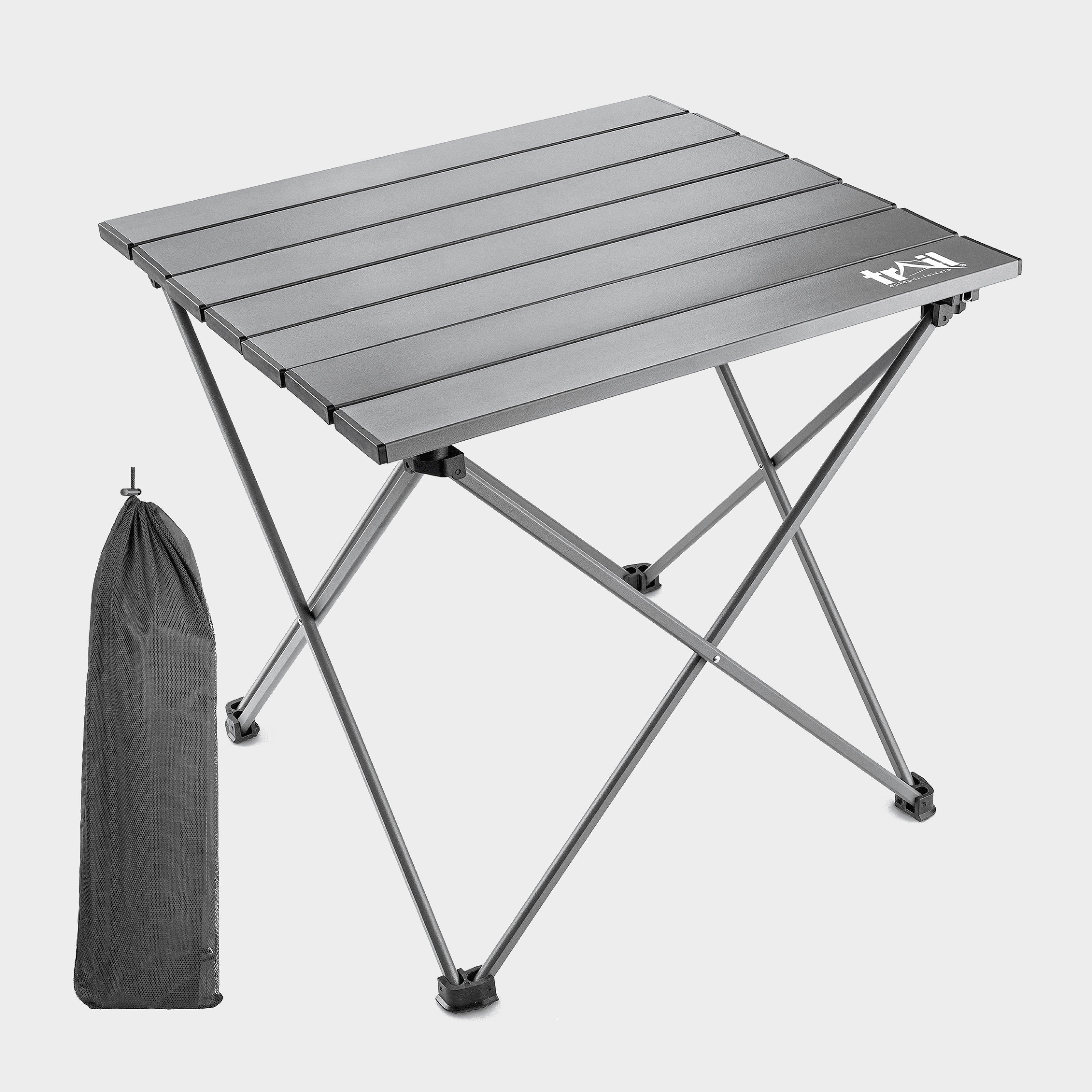 When it comes to camping, packing light is key — and tables don't come lighter than the Trail Lightweight Aluminium Camping Table. Available in three sizes, it's designed with a collapsible aluminium frame and slatted roll-top that packs into an ultra-compact carry bag for effortless storage and portability. Perfect for camping, fishing trips, beach days, festivals, picnics, and even garden parties. Easy to Set Up: Roll out the slatted aluminium top and clip it onto the frame for a quick and simple setup. Strong & Waterproof: Made entirely from aluminium — lightweight, rust-resistant, waterproof, and sturdy enough to support up to 15kg. Compact & Portable: Packs down into a durable 200D polyester bag with drawcord and internal dividers to protect the frame and tabletop._Choice of Sizes:Small: H31cm x W34cm x L37cm (900g approx.)Medium: H40cm x W40cm x L43cm (1.15kg approx.)Large: H40cm x W46cm x L49cm (1.4kg approx.)