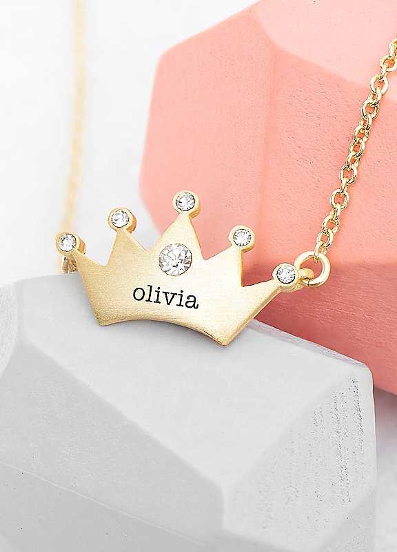 For a fabulous gift that'd be perfect for a princess of any age, she's bound to love our super-cute personalised kids princess crown necklace. This stylish necklace will make a wonderfully sentimental birthday gift for your little princess or a fabulous Christmas present for that future queen in your life.Personalise your loved one's necklace with their name for a gift that is as unique as they are.Brand: Treat RepublicPersonalise with a nameName: Up to 12 charactersGold plated necklace for herA beautiful birthday or Christmas gift for kidsComes in a beautiful black gift boxChain length approx. 49 cmCrown charm dimensions approx. 2 x 0.4 cm