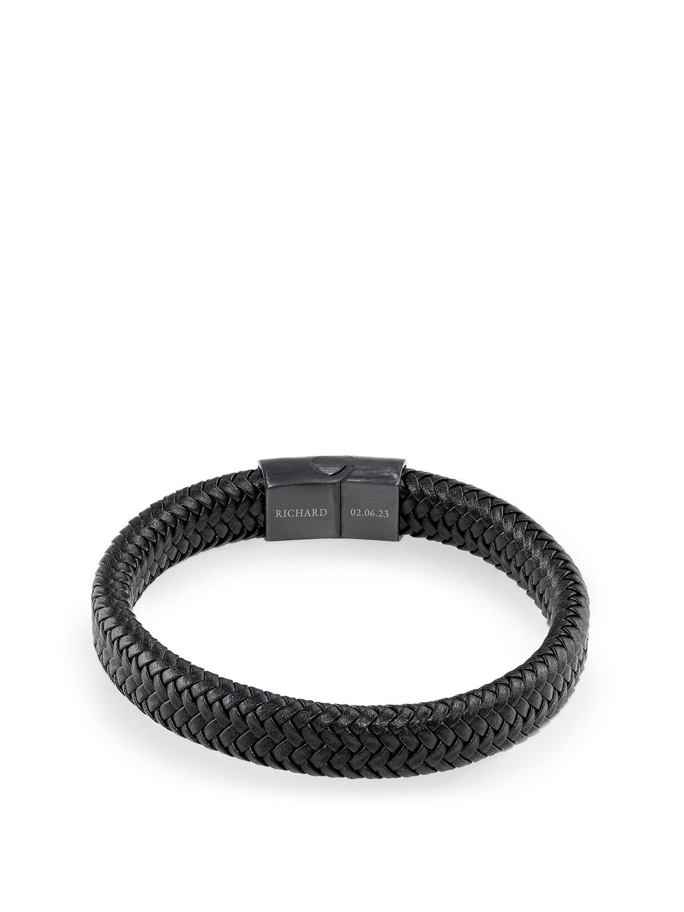 Treat Republic Personalised Men's Leather Braided Bracelet He'll absolutely adore our stylish Personalised Men's Leather Braided Bracelet. With its distinctive braided black leather design. It oozes style and is perfect for any occasion so your man can show off in style wherever he goes. He'll love the personalised touch too! This beautiful bracelet can be engraved with a fun message, so it'll be just as unique as he is! Whether you're gifting him something special on his birthday or anniversary, or simply want to give him something that expresses how much you care, this bracelet ticks every box. Personalisation: Up to 20 characters across the left and right side of the bracelet Length Open: 21.5cm Dimensions Closed: 7.6cm x 0.5cm x 1cm Depth: 10 MM Height: 5 MM Width: 215 MM Age Range: 14+ Length (in cm): 21.5 Clasp: N Expandable: N Fashion Jewellery Type: Bracelets Metal Type: Stainless Steel Personalised Men's Leather Braided Bracelet, the perfect sentimental gift for him! Personalise with engraved initials up to 20 characters long across the left and right hand side of the bracelet. Comes ready to gift in a Treat Republic gift box. Perfect for gifting for Father's Day, birthdays and anniversaries!