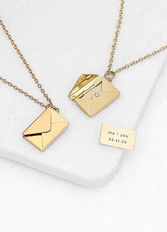 Get that special person in your life a beautiful gift for Valentine's or an anniversary with our personalised secret message envelope necklace. Open up the envelope pendant to reveal a hidden heartfelt message only the recipient will know about. It also comes beautifully packaged in a stylish gift box.Personalise her rectangular photo locket with her name or a special date.Brand: Treat RepublicPersonalise with a messageTop Line: Up to 12 charactersBottom Line: Up to 12 charactersPlated necklace for herA beautiful birthday, Valentine's or Christmas gift for herEnvelope pendant with personalised letterComes in a beautiful black gift boxAdjustable chain length approx. 50-55 cmPendant dimensions approx. 2 x 1.3 x 0.3 cm