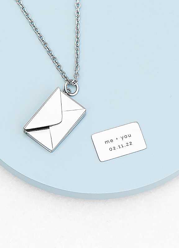Get that special person in your life a beautiful gift for Valentine's or an anniversary with our personalised secret message envelope necklace. Open up the envelope pendant to reveal a hidden heartfelt message only the recipient will know about. It also comes beautifully packaged in a stylish gift box.Personalise her rectangular photo locket with her name or a special date.Brand: Treat RepublicPersonalise with a messageTop Line: Up to 12 charactersBottom Line: Up to 12 charactersPlated necklace for herA beautiful birthday, Valentine's or Christmas gift for herEnvelope pendant with personalised letterComes in a beautiful black gift boxAdjustable chain length approx. 50-55 cmPendant dimensions approx. 2 x 1.3 x 0.3 cm