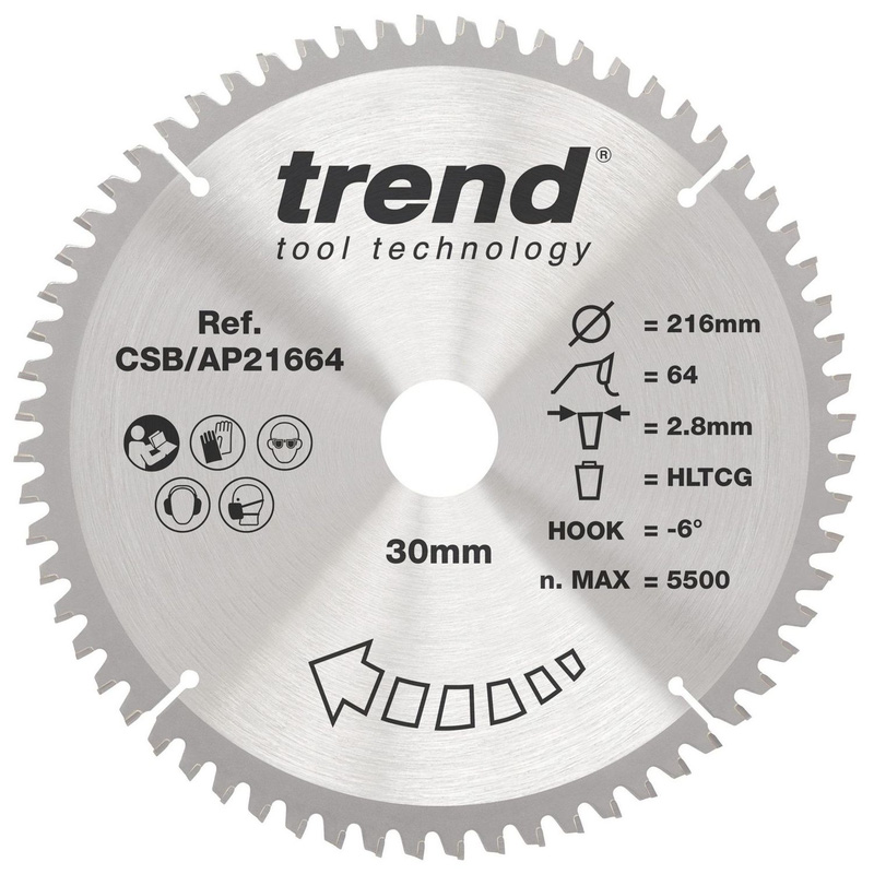 Trend CSB/AP21664 saw blade ideal for Aluminium and Plastic. These Trend circular saw blades are ideal for cutting aluminium, plastics, and non-ferrous metals. The triple chip ground (TCG) tooth form with a negative hook eliminates self-feeding, providing you with a safe, clean, and controlled cutting action. A high tooth count reduces feed and cutting speed for a clean, controlled cut. Microgranular tungsten carbide tips (TCT) ensure optimum edge retention. * Triple chip ground (TCG) tooth form with negative hook – eliminates self-feeding for a safe, controlled cutting action * High tooth count – reduces feed and cutting speed for a clean, controlled cut * Microgranular tungsten carbide tips (TCT) – ensures optimum edge retention * Expansion slots – improves heat dissipation to minimise vibration and prevent kick-back * Precision ground alloy steel plate – helps maintain flatness * Available in a choice of sizes and tooth counts | Trend Aluminium/Plastic Circular Saw Blade 216 x 30mm 64T CSB/AP21664 in Silver