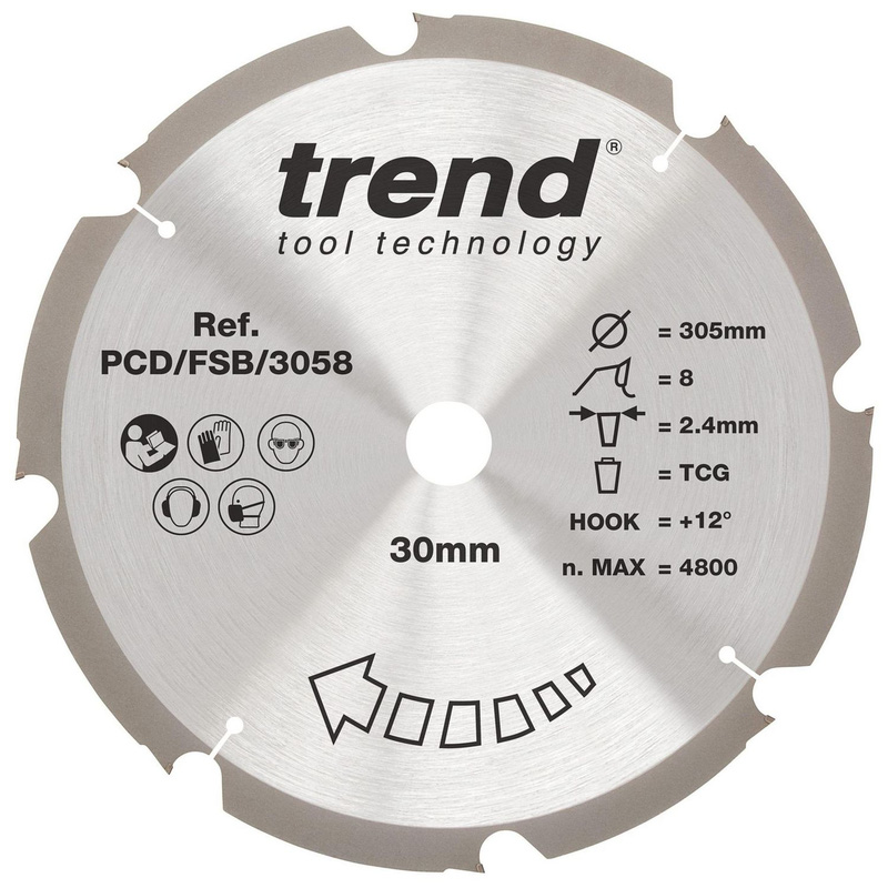 Trend PCD/FSB/3058 saw blade ideal for AQUAPANEL®, HardieBacker®, composite decking and cladding, laminate flooring, fibre and glass reinforced polymer, and compact laminate worktops. This Trend PCD Blade is ideal for cutting abrasive sheet materials such as cement fibre board, AQUAPANEL®, and compact laminate worktops. The precision EDM-ground polycrystalline diamond (PCD) tips provide you with optimum edge retention and cut quality. The triple chip ground (TCG) tooth form offers a clean, controlled, and efficient cutting action through tough materials. Expansion slots improve heat dissipation to minimise vibration and prevent kick-back. * Precision EDM-ground PCD tips – ensures optimum edge retention and cut quality in abrasive sheet materials * Triple chip ground (TCG) tooth form – provides a clean, controlled, efficient cutting action * Precision ground alloy steel plate – helps maintain flatness for accurate cutting * Expansion slots – improves heat dissipation to minimise vibration and prevent kick-back | Trend PCD Blade for Cement Fibre Board 305 x 30mm 8T in Silver | Steel