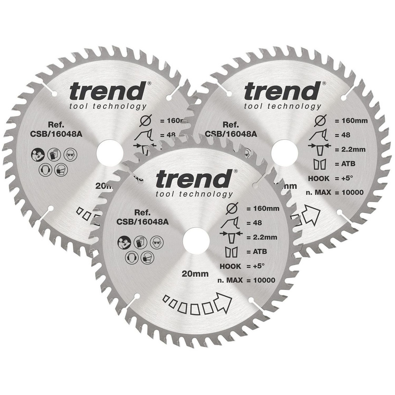 Trend CSB/160/3PK saw blades ideal for wood and wood based materials. These Trend TCT Circular Saw Blades are ideal for wood and wood-based materials. The alternate top bevel (ATB) tooth form delivers a clean, safe, and efficient cutting action in hand-held circular and table saws. Microgranular tungsten carbide tips (TCT) ensure optimum edge retention. The precision-ground alloy steel plate helps maintain flatness, while the body is hardened and tempered to minimise deflection under load. * Alternate top bevel (ATB) tooth form – delivers a clean, safe, and efficient cutting action * Microgranular tungsten carbide tips (TCT) – ensures optimum edge retention * Precision ground alloy steel plate – helps maintain flatness for accurate cutting * Expansion slots – improves heat dissipation to minimise vibration and prevent kick-back * Anti-kickback shoulders – limits feed-speeds to minimise kickback * Available in a choice of pack types and tooth configurations | Trend Wood TCT Circular Saw Blades 160 x 20mm 48T CSB/160/3PK (3 Pack) in Silver | Steel