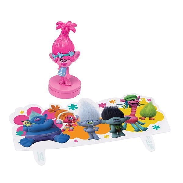 Decorate a Trolls inspired celebration cake quickly and easily with this fantastic cake decorating set! This DecoSet features a food-safe decorative background that easily slots into a cake and a Poppy figurine for instant cake decoration