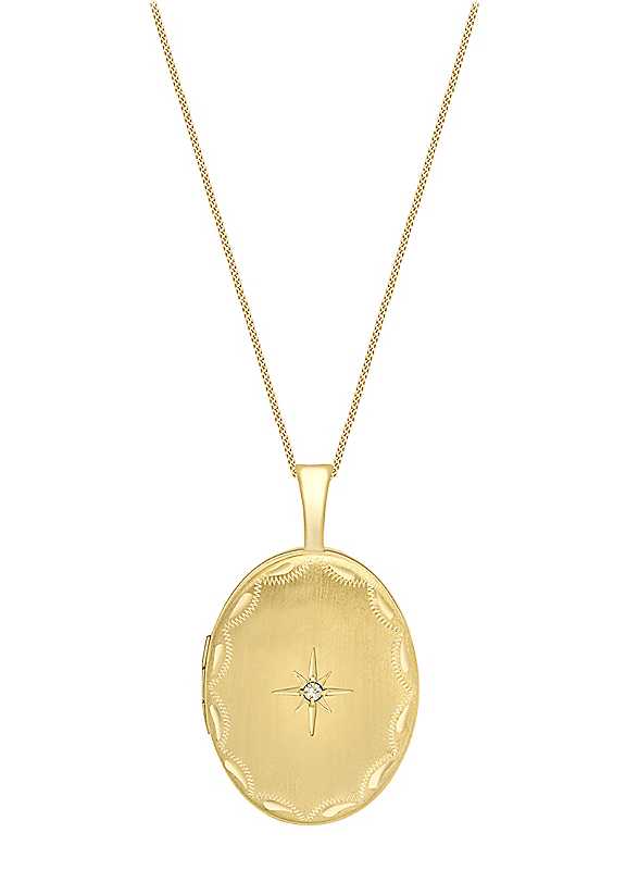Tuscany Gold 9ct Yellow Gold 0.01ct Diamond Set Etched Oval Locket & Curb Chain 18ins