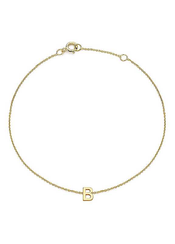 Whether as a representation of your name, a loved one, or simply because you just like that letter this initial bracelet adds a subtle, heartfelt touch to your look. The bracelet is made from 9ct yellow gold and is secure with a spring ring fastening. Great as a gift or as a treat for yourself. Brand: Tuscany Gold Gift box Weight: 0.4g Fitting: Spring ring 9ct Gold Bracelet adjustable length approx. 15 - 18.5 cm (6-7.25 in) Chain width approx. 0.7 mm Letter width approx. 5 mm Bracelet width approx. 4 x 4. 5 mm | 9ct gold bracelet, adjustable gold bracelet, initial gold bracelet, thin gold bracelet, delicate gold bracelet