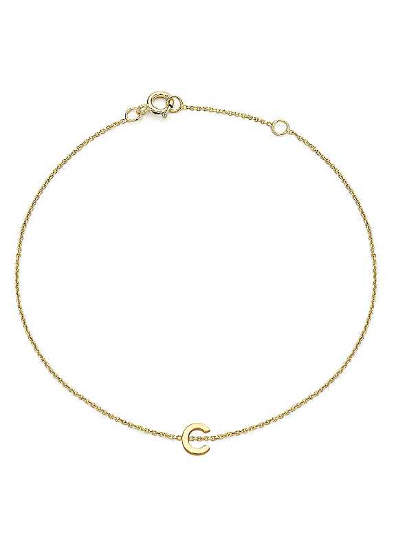 Whether as a representation of your name, a loved one, or simply because you just like that letter this initial bracelet adds a subtle, heartfelt touch to your look. The bracelet is made from 9ct yellow gold and is secure with a spring ring fastening. Great as a gift or as a treat for yourself. Brand: Tuscany Gold Gift box Weight: 0.4g Fitting: Spring ring 9ct Gold Bracelet adjustable length approx. 15 - 18.5 cm (6-7.25 in) Chain width approx. 0.7 mm Letter width approx. 5 mm Bracelet width approx. 4 x 4. 5 mm | 9ct gold bracelet, adjustable gold bracelet, initial gold bracelet, thin gold bracelet, delicate gold bracelet