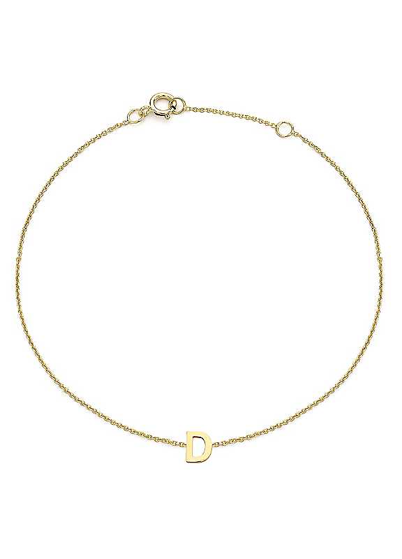 Whether as a representation of your name, a loved one, or simply because you just like that letter this initial bracelet adds a subtle, heartfelt touch to your look. The bracelet is made from 9ct yellow gold and is secure with a spring ring fastening. Great as a gift or as a treat for yourself. Brand: Tuscany Gold Gift box Weight: 0.4g Fitting: Spring ring 9ct Gold Bracelet adjustable length approx. 15 - 18.5 cm (6-7.25 in) Chain width approx. 0.7 mm Letter width approx. 5 mm Bracelet width approx. 4 x 4. 5 mm | 9ct gold bracelet, adjustable gold bracelet, initial gold bracelet, thin gold bracelet, delicate gold bracelet