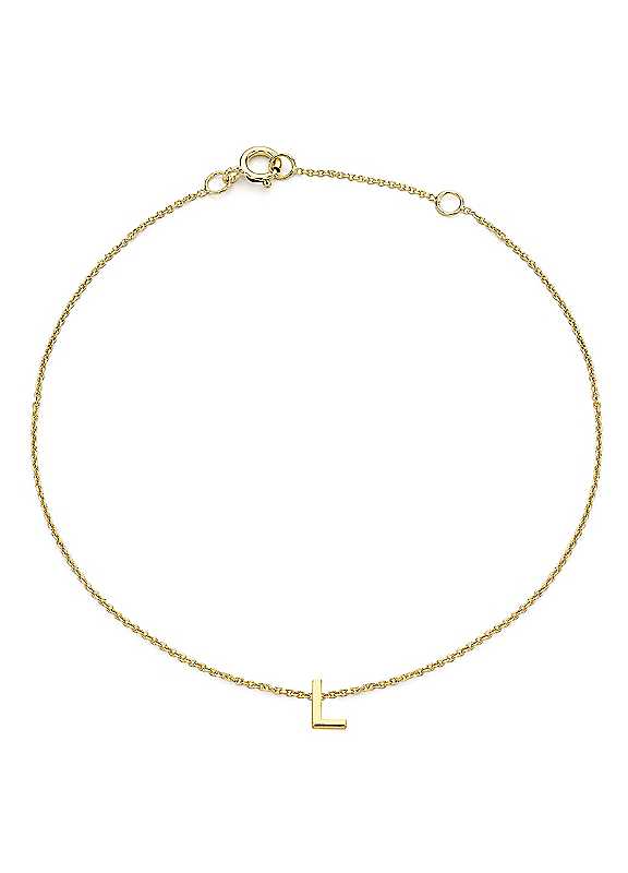 Whether as a representation of your name, a loved one, or simply because you just like that letter this initial bracelet adds a subtle, heartfelt touch to your look. The bracelet is made from 9ct yellow gold and is secure with a spring ring fastening. Great as a gift or as a treat for yourself. Brand: Tuscany Gold Gift box Weight: 0.4g Fitting: Spring ring 9ct Gold Bracelet adjustable length approx. 15 - 18.5 cm (6-7.25 in) Chain width approx. 0.7 mm Letter width approx. 5 mm Bracelet width approx. 4 x 4. 5 mm | 9ct gold bracelet, adjustable gold bracelet, initial gold bracelet, thin gold bracelet, delicate gold bracelet