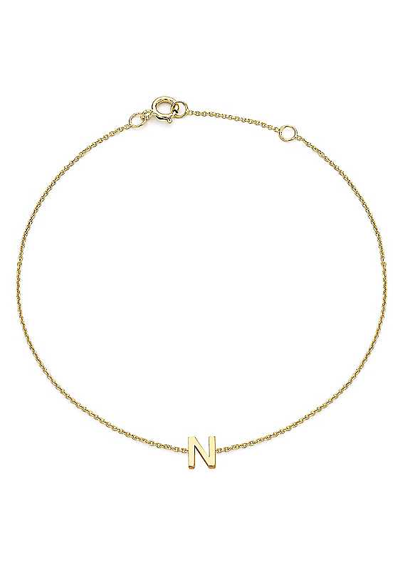 Whether as a representation of your name, a loved one, or simply because you just like that letter this initial bracelet adds a subtle, heartfelt touch to your look. The bracelet is made from 9ct yellow gold and is secure with a spring ring fastening. Great as a gift or as a treat for yourself. Brand: Tuscany Gold Gift box Weight: 0.4g Fitting: Spring ring 9ct Gold Bracelet adjustable length approx. 15 - 18.5 cm (6-7.25 in) Chain width approx. 0.7 mm Letter width approx. 5 mm Bracelet width approx. 4 x 4. 5 mm | 9ct gold bracelet, adjustable gold bracelet, initial gold bracelet, thin gold bracelet, delicate gold bracelet