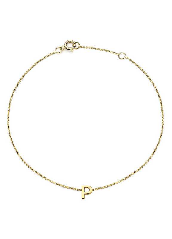 Whether as a representation of your name, a loved one, or simply because you just like that letter this initial bracelet adds a subtle, heartfelt touch to your look. The bracelet is made from 9ct yellow gold and is secure with a spring ring fastening. Great as a gift or as a treat for yourself. Brand: Tuscany Gold Gift box Weight: 0.4g Fitting: Spring ring 9ct Gold Bracelet adjustable length approx. 15 - 18.5 cm (6-7.25 in) Chain width approx. 0.7 mm Letter width approx. 5 mm Bracelet width approx. 4 x 4. 5 mm | 9ct gold bracelet, adjustable gold bracelet, initial gold bracelet, thin gold bracelet, delicate gold bracelet