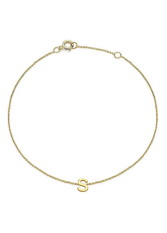 Whether as a representation of your name, a loved one, or simply because you just like that letter this initial bracelet adds a subtle, heartfelt touch to your look. The bracelet is made from 9ct yellow gold and is secure with a spring ring fastening. Great as a gift or as a treat for yourself. Brand: Tuscany Gold Gift box Weight: 0.4g Fitting: Spring ring 9ct Gold Bracelet adjustable length approx. 15 - 18.5 cm (6-7.25 in) Chain width approx. 0.7 mm Letter width approx. 5 mm Bracelet width approx. 4 x 4. 5 mm | 9ct gold bracelet, adjustable gold bracelet, initial gold bracelet, thin gold bracelet, delicate gold bracelet