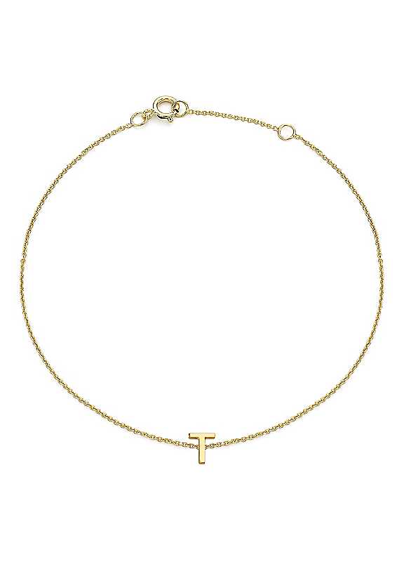 Whether as a representation of your name, a loved one, or simply because you just like that letter this initial bracelet adds a subtle, heartfelt touch to your look. The bracelet is made from 9ct yellow gold and is secure with a spring ring fastening. Great as a gift or as a treat for yourself. Brand: Tuscany Gold Gift box Weight: 0.4g Fitting: Spring ring 9ct Gold Bracelet adjustable length approx. 15 - 18.5 cm (6-7.25 in) Chain width approx. 0.7 mm Letter width approx. 5 mm Bracelet width approx. 4 x 4. 5 mm | 9ct gold bracelet, adjustable gold bracelet, initial gold bracelet, thin gold bracelet, delicate gold bracelet