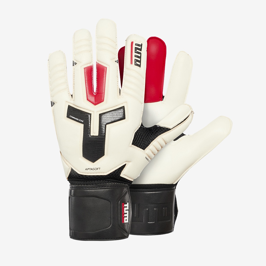 TUTO is taking goalkeeping performance to a whole new level thanks to its dedicated and innovative approach and design. Embrace the warrior spirit within, with the TUTO Aptasoft Junior FP. Increasing the contact zone with the ball due to the nature of the cut, the flat palm of the finger save glove features layered air mesh gusset inserts between the fingers for added breathability. Palm 3mm Softy foam is combined with TUTOs unique Invictus foam that features in the signature red middle fingers. Punchzone Embossed silicon printed latex on both sections. Wrist strap 2mm latex.