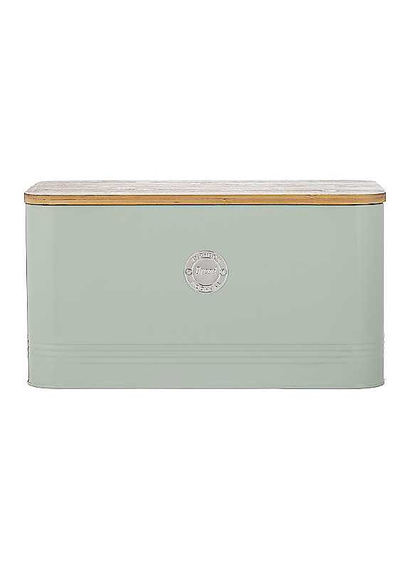 The Living Squircle Bread Bin features a stunning mint green design with rounded edges, which will look lovely on any kitchen worktop. The chrome 'Bread' badge gives a touch of elegance while being practical and keeping you organised. With a generous 9 litre capacity, it is ideal for storing fresh bakes and cakes, with a specially-designed bamboo lid that can be used as a cutting and serving board, as well as for keeping contents fresh. Made from 100% recyclable steel, this bread bin is hard-wearing and durable, making it perfect for everyday use. Part of a wider Living Squircle range. H 18 x W 33.8 x D 19.2cm 9ltrCapacity: 9LWipe with damp cloth, Avoid use of abrasive sponges, Wash before first useCarbon SteelDimensions approx. 17 x 19 x 33.5cm