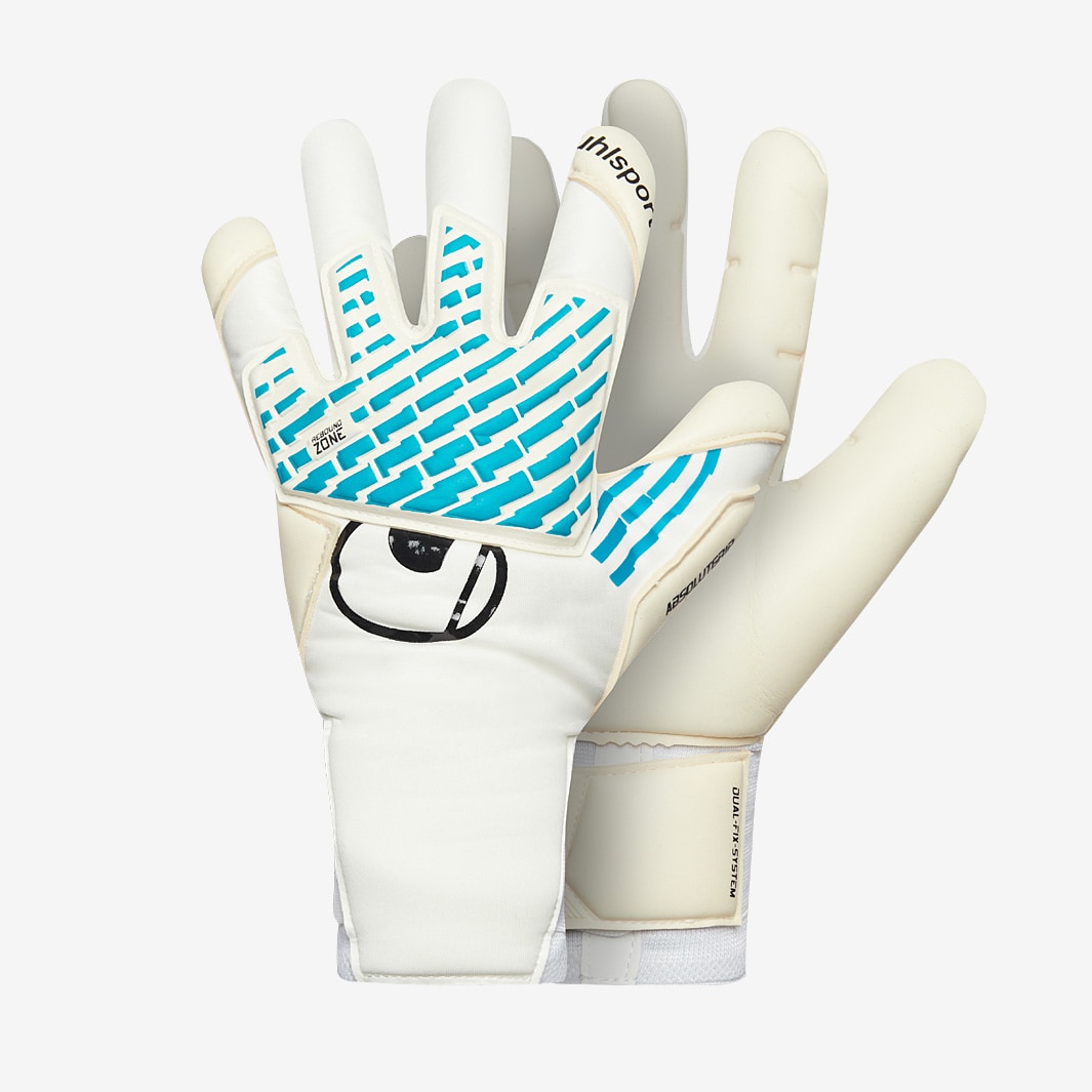 Become the ultimate goalkeeping machine with Uhlsport FOAM Cybertec Absolutgrip SC goalkeeper gloves in WhiteCyber BlueBlack, featuring a highly efficient REBOUND ZONE on the backhand for perfect performance. Designed to provide grip and punching power while allowing natural flexion of the hand, the strategically placed silicone strips let you dominate your box with absolute confidence.On the palm, ABSOLUTGRIP offers the ideal balance between grip, cushioning, and durability, excelling in dry conditions but maintaining reliable performance in wet weather too.This versions the supertight Skin Cut with the ULTIMATE CONTACT wrap, which sees the latex extend around the hand and down the wrist for even more grip. Great for hanging on to the ball when you come to claim and maintaining control over throws as you look to counter.At the wrist, Uhlsports DUAL FIX SYSTEM uses two straps for easier fastening and improved stability, so your gloves always feel secure and ready for action. Foam Patented ABSOLUTGRIP for enhanced cushioning and outstanding grip in all weather conditions Cut Skin supertight cut for close feel on the ball Glove Body Functional neoprene for best flexibility and wearing comfort Closure DUAL FIX SYSTEM innovative closure system for optimised fixation and maximum flexibility of the wrist REBOUND ZONE provides maximum flexibility and perfect punching ULTIMATE CONTACT innovative wrap construction for maximum grip in all catching situations and perfect fit FLEX ENTRY elastic entry guarantees maximum flexibility and wearing comfort 3D FLEX 3D foam thermoforming for maximum flexibility