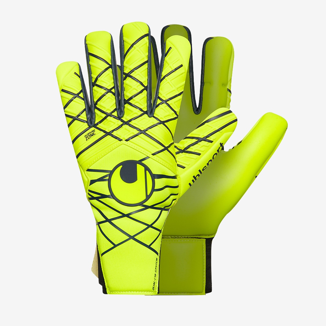 Read the game and take control with Uhlsport Kids Prediction Energy Edition Absolutgrip HN goalkeeper gloves in Fluo YellowNavy, featuring a grip net structure on the backhand for improved flexibility and grip. The eyecatching lattice pattern allows natural flexion of the hand thanks to the placement of the grip lines, while also increasing ball contact for greater purchase on punches. On the palm, ABSOLUTGRIP offers the ideal balance between grip, cushioning, and durability, excelling in dry conditions but maintaining reliable performance in wet weather too. This versions a halfnegative cut with additional latex on the extremities of the backhand and the fingertips for extra coverage and control. At the wrist, Uhlsports DUAL FIX SYSTEM uses two straps for easier fastening and improved stability, so your gloves always feel secure and ready for action. Foam Patented ABSOLUTGRIP for enhanced cushioning and outstanding grip in all weather conditions Cut HalfNegative inner seam construction ensures a tight fit and maximum ball control Glove Body Functional neoprene for best flexibility and wearing comfort Closure DUAL FIX SYSTEM innovative closure system for optimised fixation and maximum flexibility of the wrist REBOUND ZONE provides maximum flexibility and perfect punching FLEX ENTRY elastic entry guarantees maximum flexibility and wearing comfort 3D FLEX 3D foam thermoforming for maximum flexibility