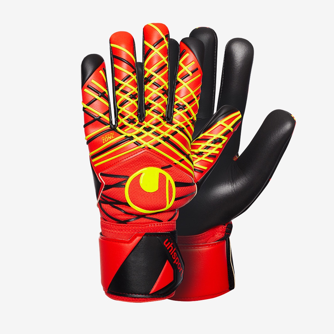 Read the game and take control with Uhlsport Prediction Supersoft HN goalkeeper gloves in RedBlackFluo Yellow, featuring a grip net structure on the backhand for improved flexibility and grip. The eyecatching lattice pattern allows natural flexion of the hand thanks to the placement of the grip lines, while also increasing ball contact for greater purchase on punches. On the palm, everpopular SUPERSOFT foam provides prolevel grip in both wet and dry conditions and cushions even the hardest shots. This versions a halfnegative cut with additional latex on the extremities of the backhand and the fingertips for extra coverage and control. At the wrist, a traditional full bandage strap keeps your gloves secure and ready for action. Foam SUPERSOFT foam for enhanced cushioning and great grip in all conditions Cut HalfNegative inner seam construction ensures a tight fit and maximum ball control Glove Body Breathable and comfortable textile material Closure Wraparound latex strap and full bandage for secure fit at wrist REBOUND ZONE provides maximum flexibility and perfect punching