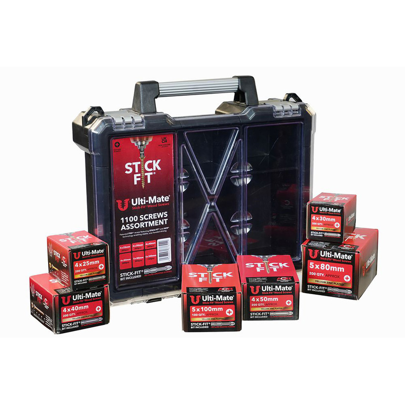 The Ulti-Mate® Heavy Duty Trade Case Assortment contains 1100 high-performance Stick-Fit® woodscrews in 6x essential sizes. The robust carry case provides secure storage and easy access to the boxes of screws inside. Ulti-Mate® woodscrews feature patented Stick-Fit® technology that enables smooth, wobble-free driving and one-handed installation. High-quality Stick-Fit Driver Bit included in every box (6x in total) The Ulti-Mate® Heavy Duty Trade Case Assortment contains 1100 high-performance Stick-Fit® wood screws in 6x essential sizes. The robust carry case provides secure storage and easy access to the boxes of screws inside. Ulti-Mate® wood screws feature patented Stick-Fit® technology that enables smooth, wobble-free driving and one-handed installation. The screws also feature a type-17 cutter point to drive through the toughest timber, a wide, deep single thread and a double-angle countersunk head for a neat, flush finish. | Ulti-Mate ® Stick-Fit® Wood Screws Assortment Case (1100 Piece) in Gold