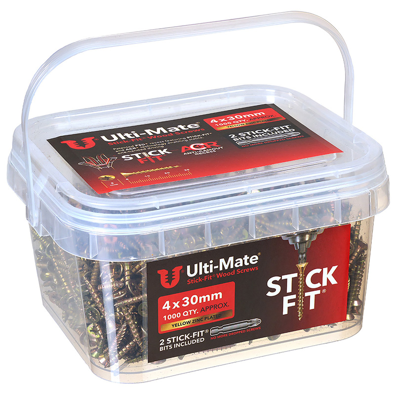 Patented Stick-Fit drive system allows smooth, stable driving and one-handed installation 2x high-quality Stick-Fit Driver Bits included in every Trade Tub Drive system 100% compatible with POZI and Phillips driver bits Double-angle self countersinking head Deep wide single thread 1000 Screws & 2x Stick-Fit® Driver Bits The Ulti-Mate® Wood Screw is a trade-quality, high-performance woodscrew that can be used for fixing hardwood, softwood, man-made timber boards (e. g. MDF, plywood, chipboard & OSB), and sheet metal. 2x high-quality Stick-Fit driver bits are included in every single trade tub of Ulti-Mate® Wood Screws. The screws also feature a sharp point to drive through the hardest timber, a double-angle countersunk head for a neat finish and a wide, deep single thread for rapid insertion and strong holding power. | Ulti-Mate Stick-Fit Woodscrews Tub 4.0 x 30mm (1000pk) in Gold