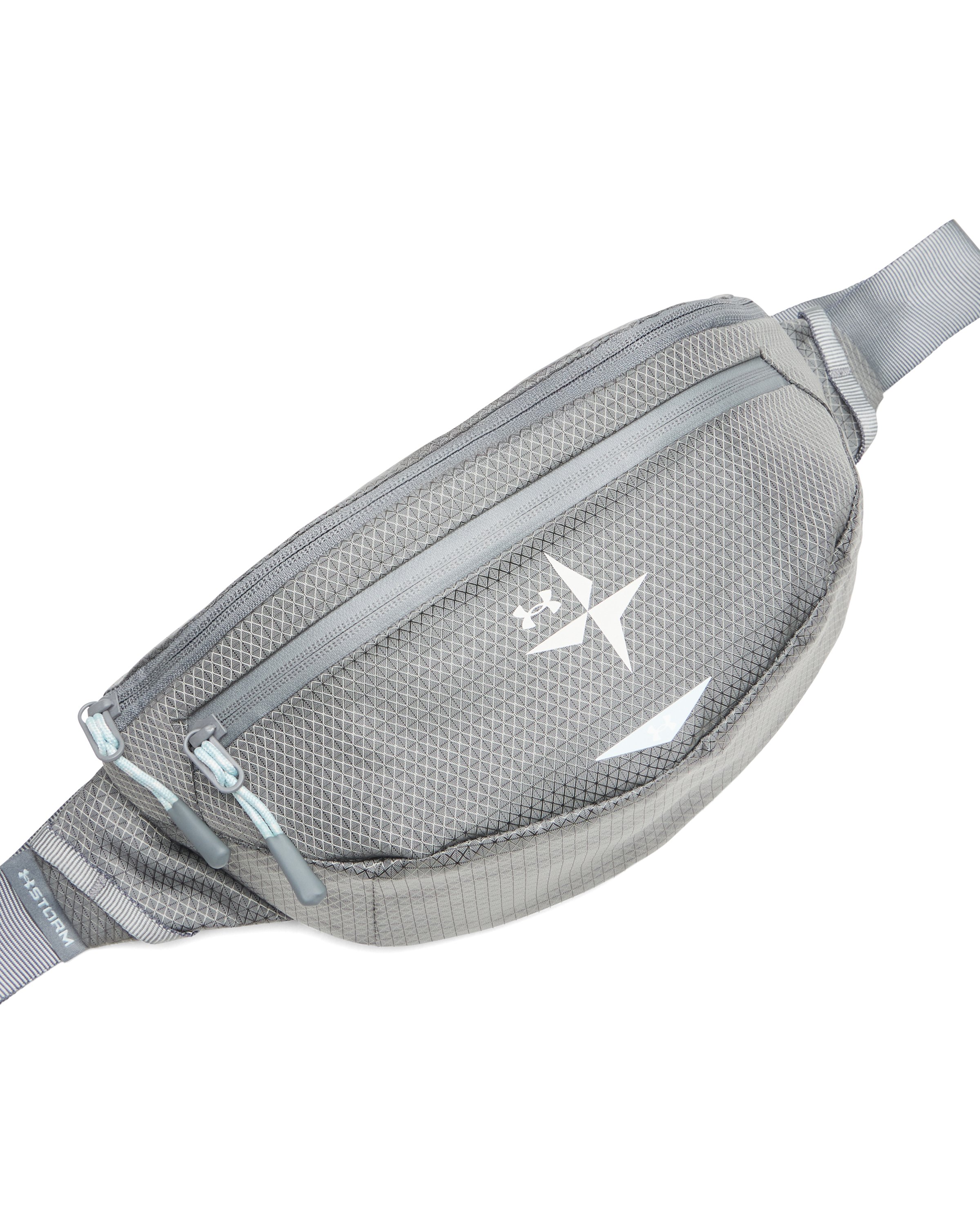 Water-resistant UA Storm technology keeps your essentials dry|Ultra-durable ripstop nylon material|2 secure zip front pockets for easy access & essential item storage|Interior mesh drop-in pocket & secure zip back pocket|Adjustable webbing strap for a custom, secure fit|Uses a fluorine-free water repellent treatment|Main body fabric contains at least 90% recycled nylon, excluding trims & embellishments - Style #: 6010585|Dimensions When Full: 11"W x 3.7"H x 6.7"L|Volume: 3 L|67% Nylon/33% Polyester|Imported