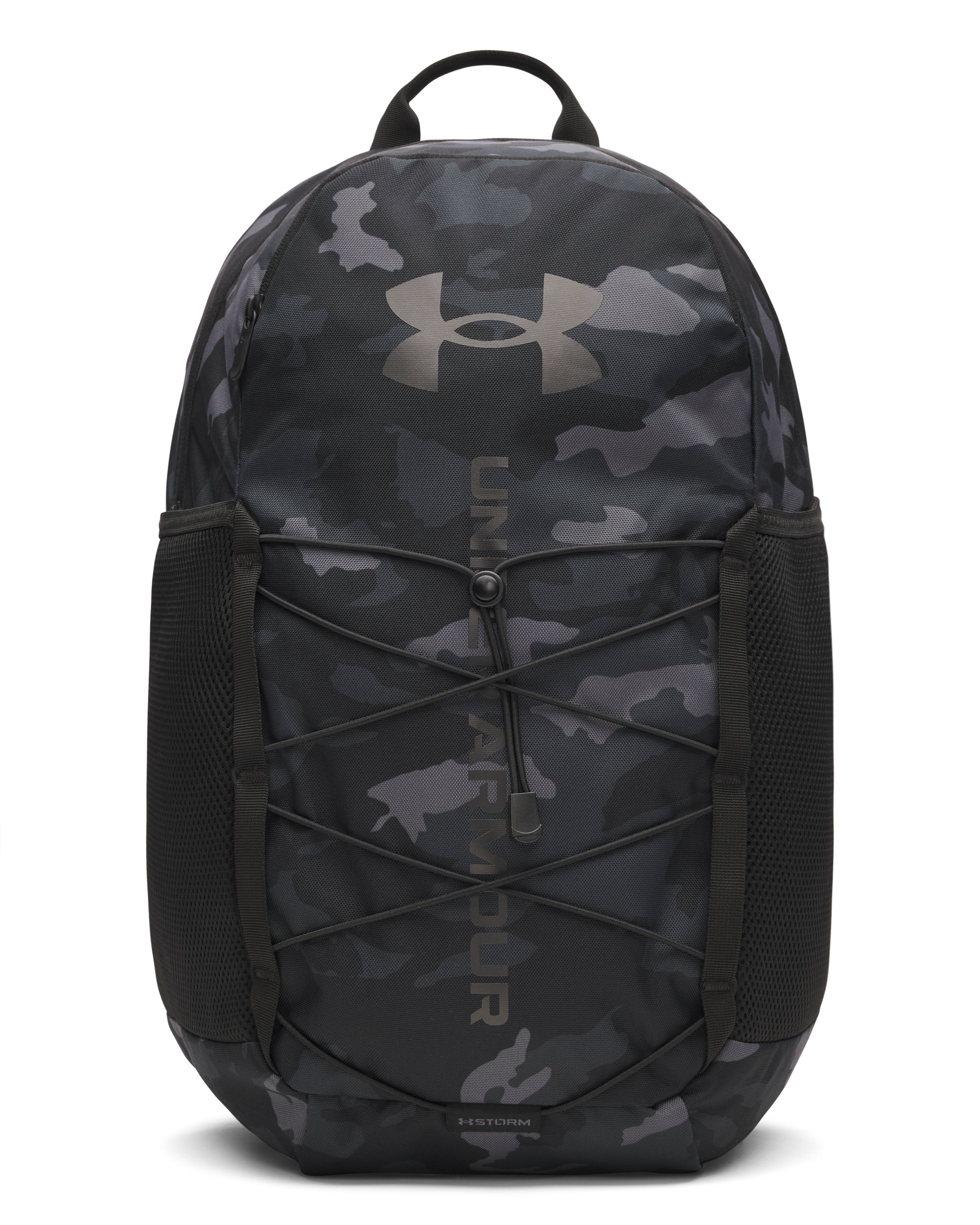 Water-resistant UA Storm technology keeps your essentials dry|Padded back panel & shaped straps make it more comfortable to carry|Soft-lined laptop sleeve with organization panel—holds up to 16" MacBook Pro® or similarly sized laptop|Front sleeve with bungee adjust closure for easily stashing a jacket, pair of shoes or ball|Large, zippered front valuables pocket|Durable, abrasion-resistant coated bottom|2 side water bottle pockets fits up to 32 oz bottle|Uses a fluorine-free water repellent treatment - Style #: 6000397|Top grab handle|Dimensions When Full: 12.6"H x 7.4"W x 18.5"D|Volume: 26L|100% Polyester|Imported