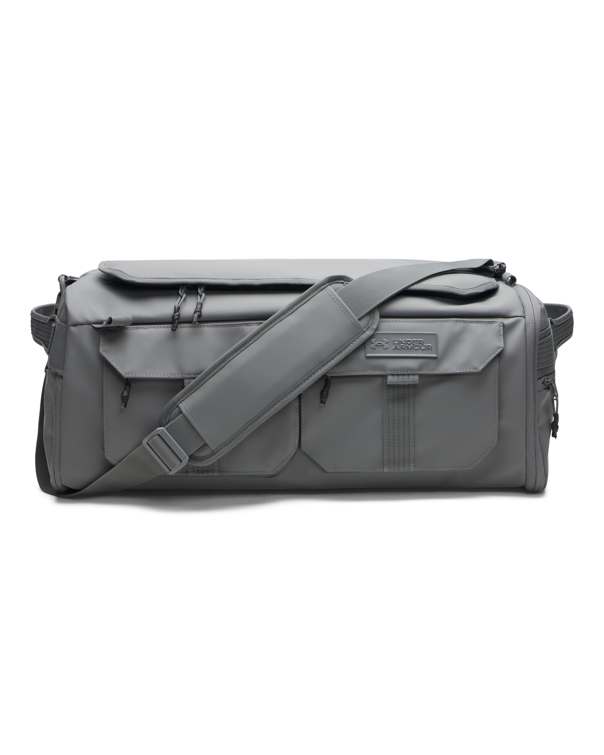 Water-resistant UA Storm technology keeps your essentials dry|Works as both a backpack & duffle with adjustable shoulder straps & grab handles|LEVELED™ strap system guides you to assure straps are adjusted evenly for balanced weight distribution|Soft-to-the-touch top coat on material for added durability|Soft-lined laptop sleeve holds up to a 15" laptop|Main compartment is expandable for extra space when you need it & has an interior shoe pocket|Secure zipper & flap pockets on front for valuables|Ribbed nylon molle webbing attachment points - Style #: 1384664|Metal wordmark plaque branding|Dimensions When Full: 13"W x 9.4"H x 20.9"L|Volume: 43.5 L (unexpanded) / 48 L (expanded)|62% Polyester/38% Polyurethane|Imported