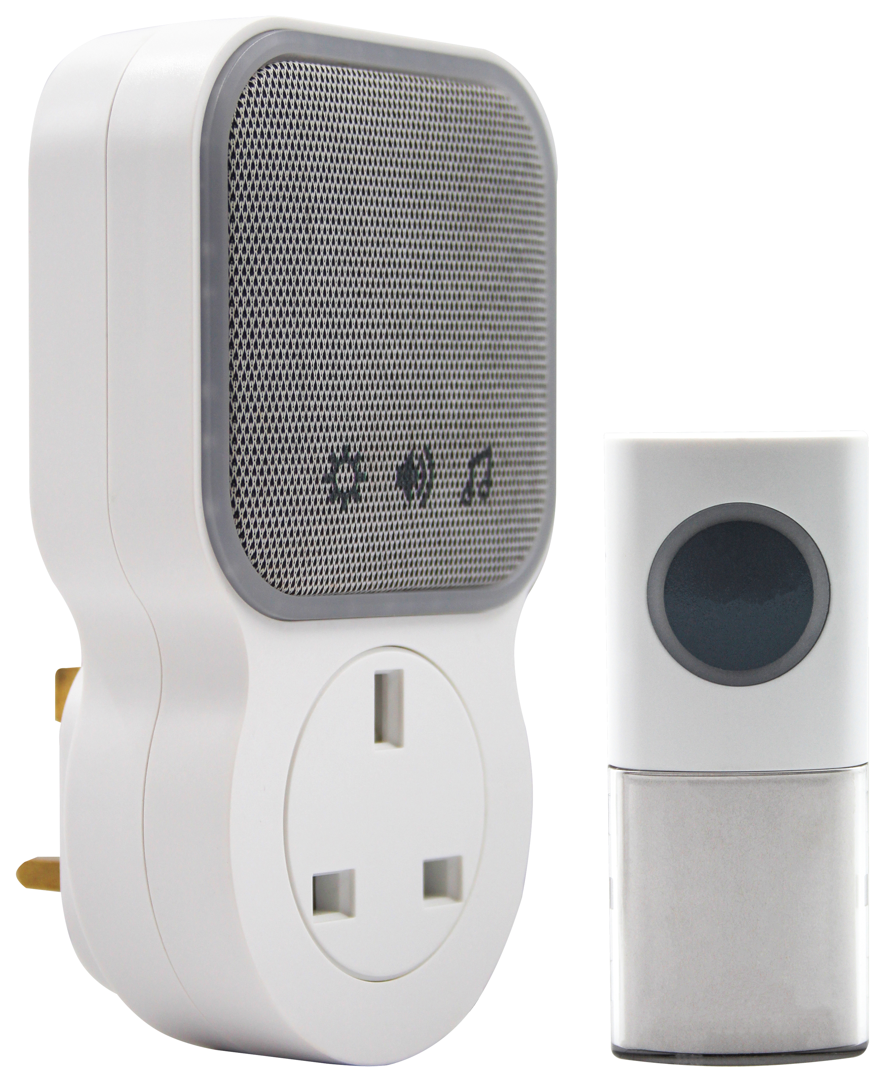 Uni-Com Plug Through Door Chime - White - The Uni-Com Plug Through Door Chime simply plugs into any 13A socket around your home, and with the plug-through feature, your mains socket is still available for use with other appliances. It is wireless, so no wiring is required, and with an extensive operating range of up to 150m, you never have to miss a visitor or delivery. With 30 different chime melodies to choose from, 90dB(A) sound output with volume control and a flashing blue chime alert, you will always know when somebody is at your door.